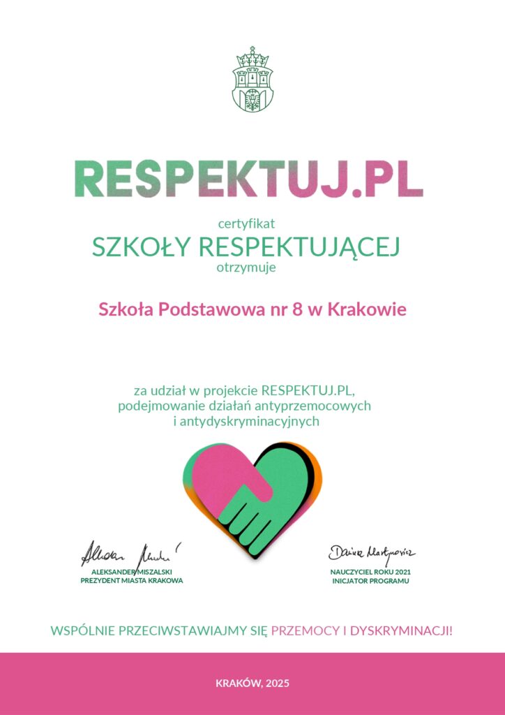 Z radością informujemy, że podejmowane przez nas inicjatywy zostały docenione – szkoła otrzymała Certyfikat potwierdzający udział i zaangażowanie w kampanię Respektuj.pl