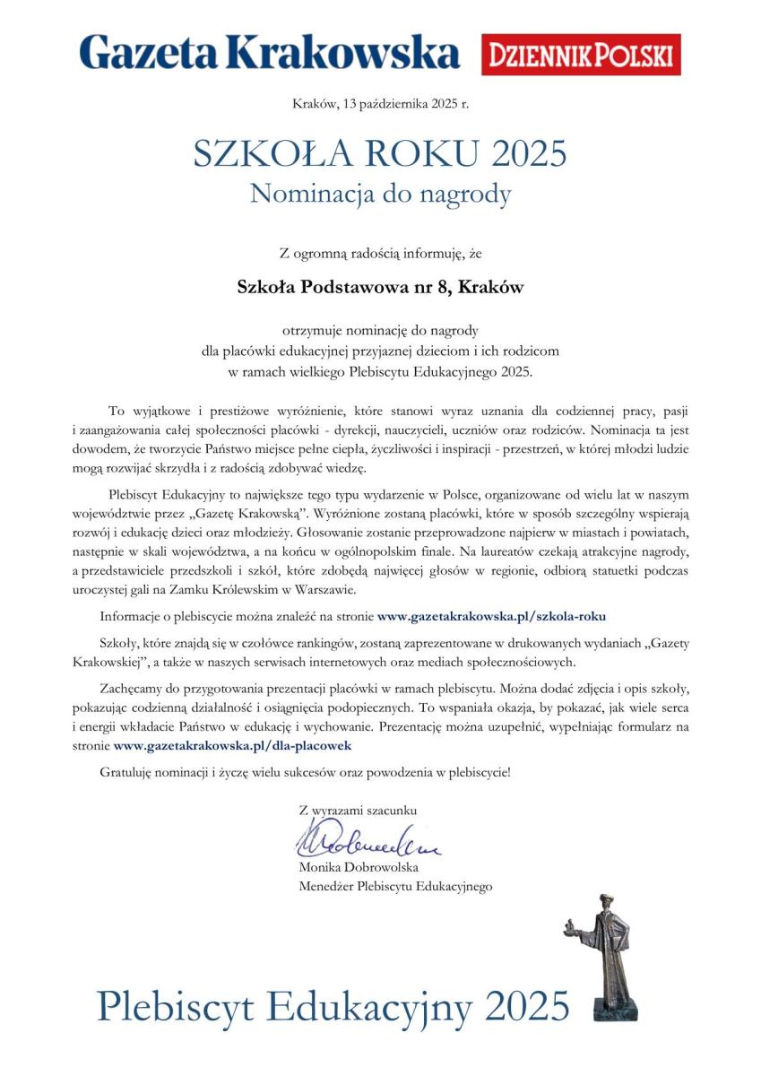 Z wielką przyjemnością informujemy, że nasza Szkoła została zgłoszona do nagrody w tegorocznej edycji Plebiscytu Edukacyjnego 2025, nad którym patronat objęły m.in. Gazeta Krakowska oraz Dziennik Polski.