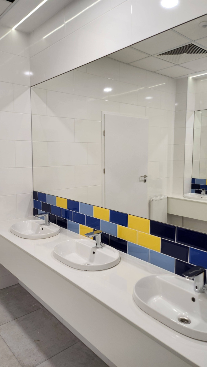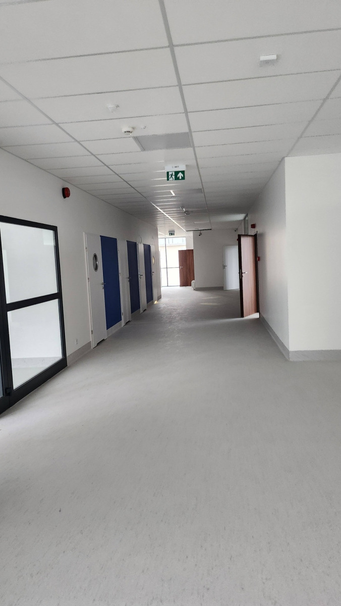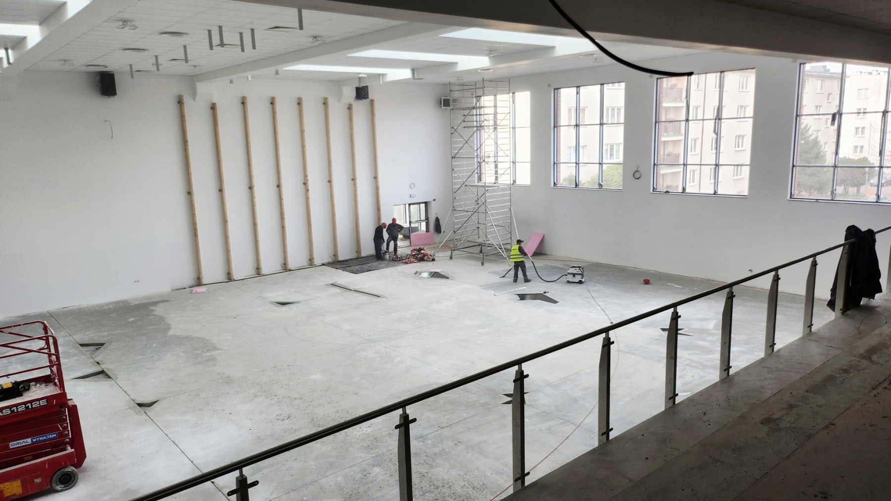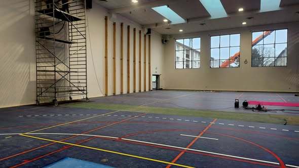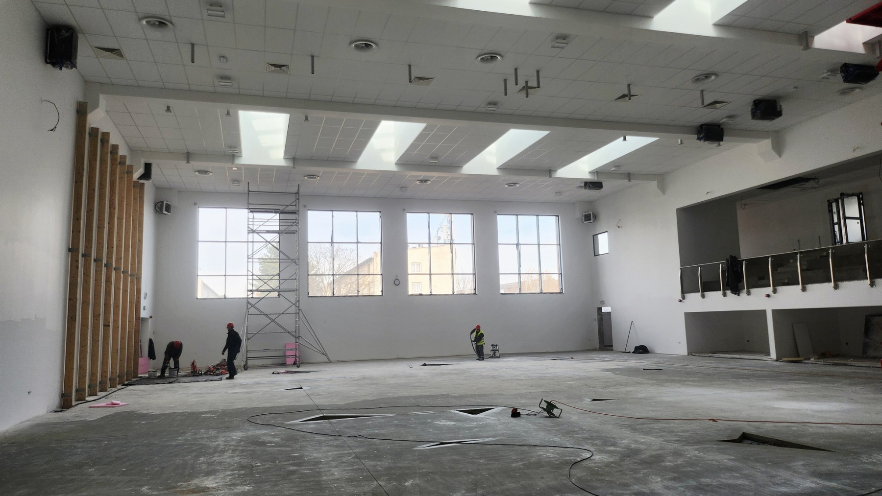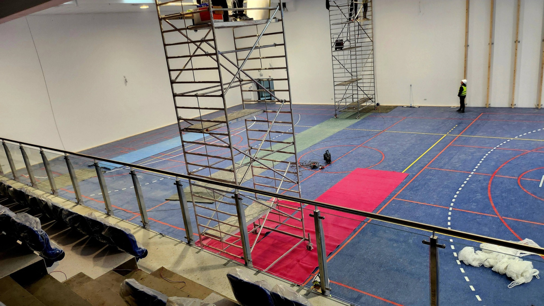 Dzisiejsza wizyta na budowie przyniosła nam wiele radości – z każdym krokiem widać, jak nasza nowa szkoła pięknieje. Na sali gimnastycznej pojawiły się już starannie wymalowane linie do gier zespołowych, a wokół trwają intensywne prace wykończeniowe.