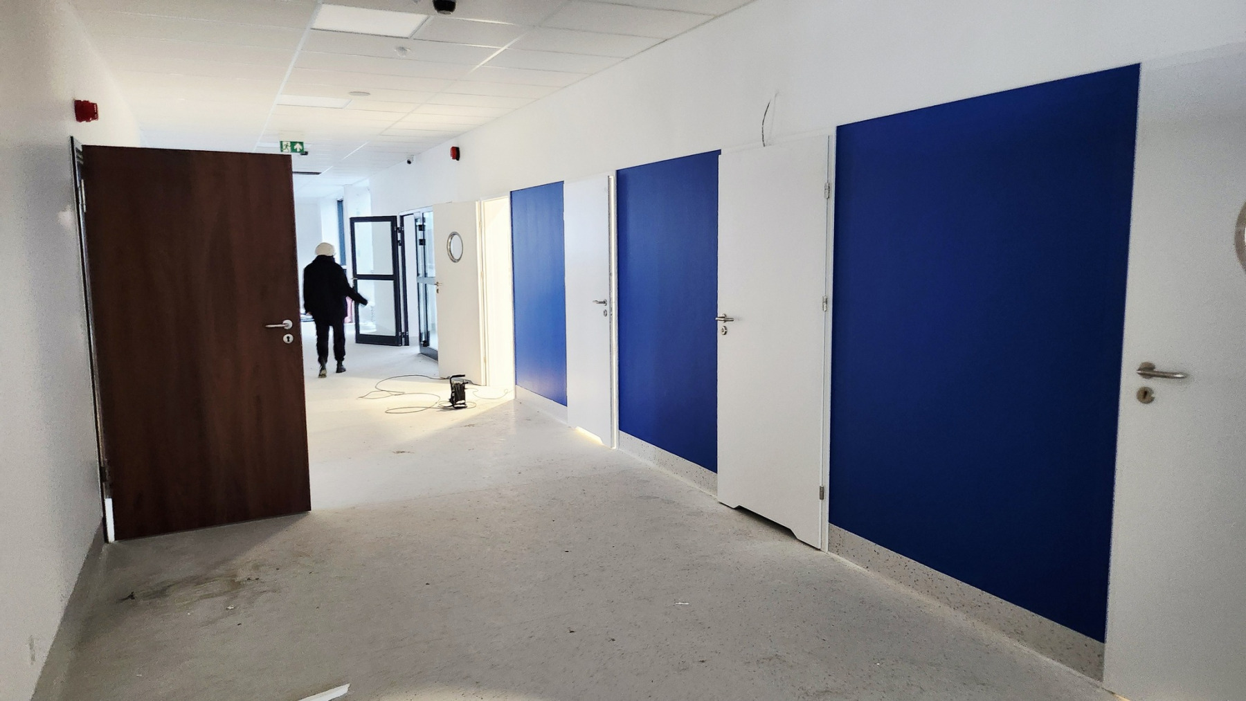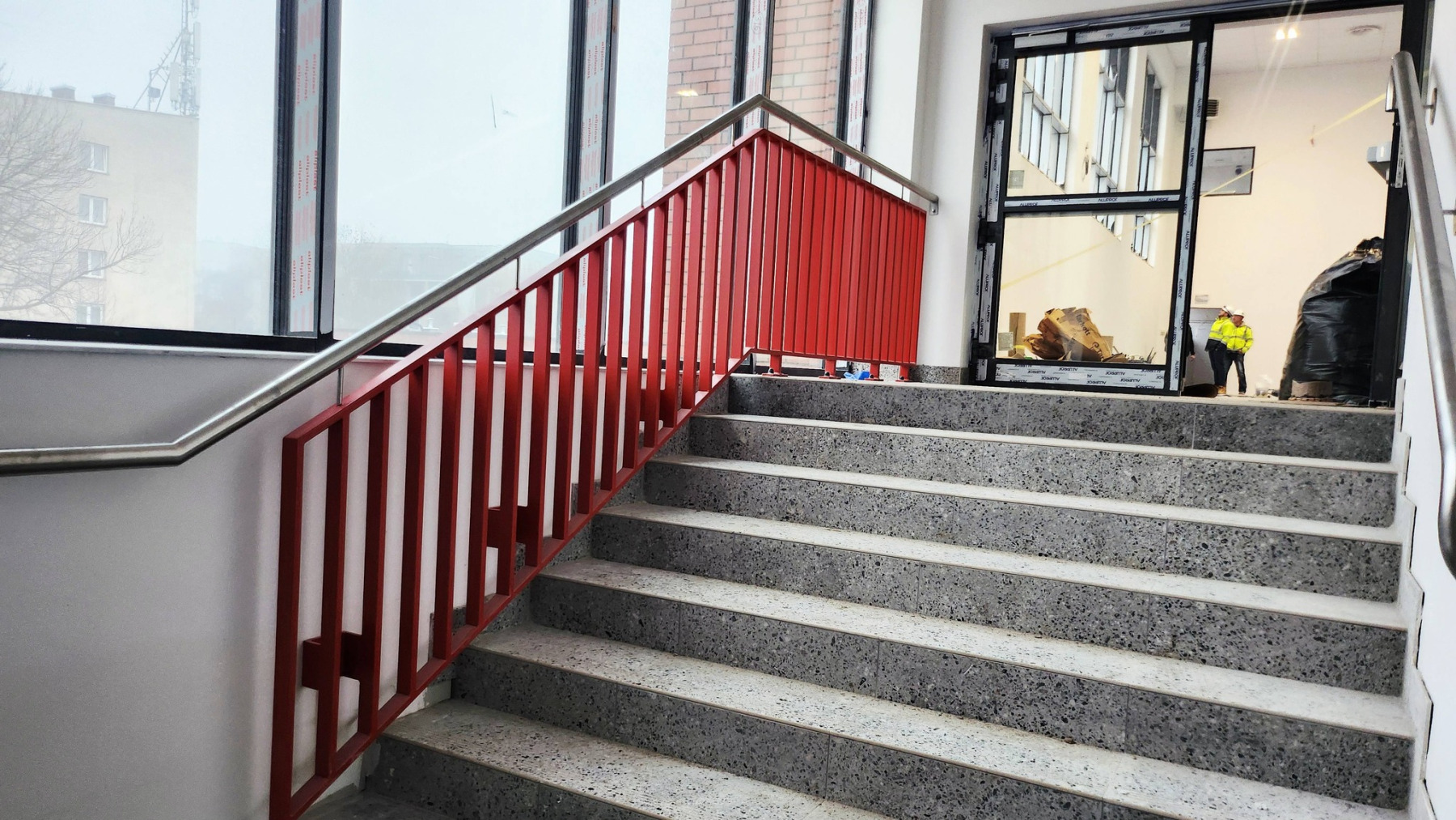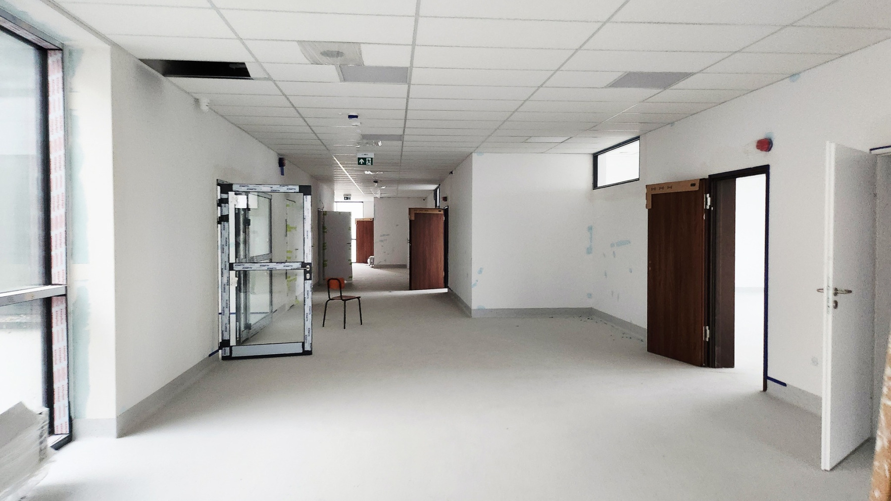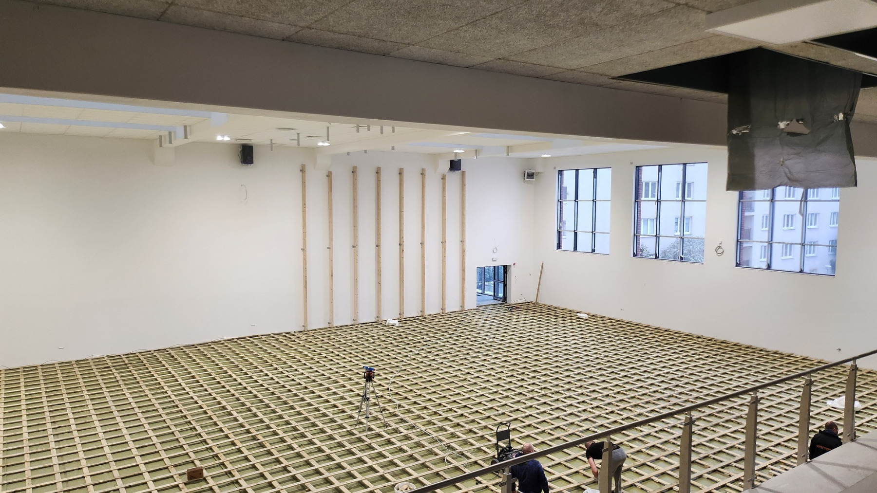 Dzisiejsza wizyta na budowie przyniosła nam wiele radości – z każdym krokiem widać, jak nasza nowa szkoła pięknieje. Na sali gimnastycznej pojawiły się już starannie wymalowane linie do gier zespołowych, a wokół trwają intensywne prace wykończeniowe.