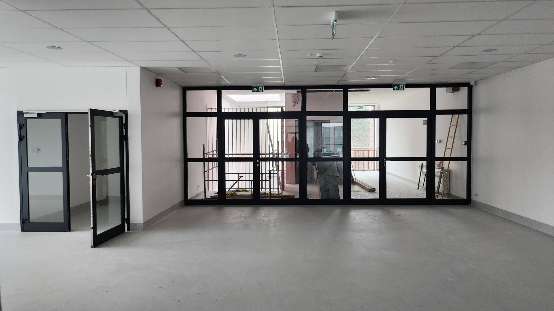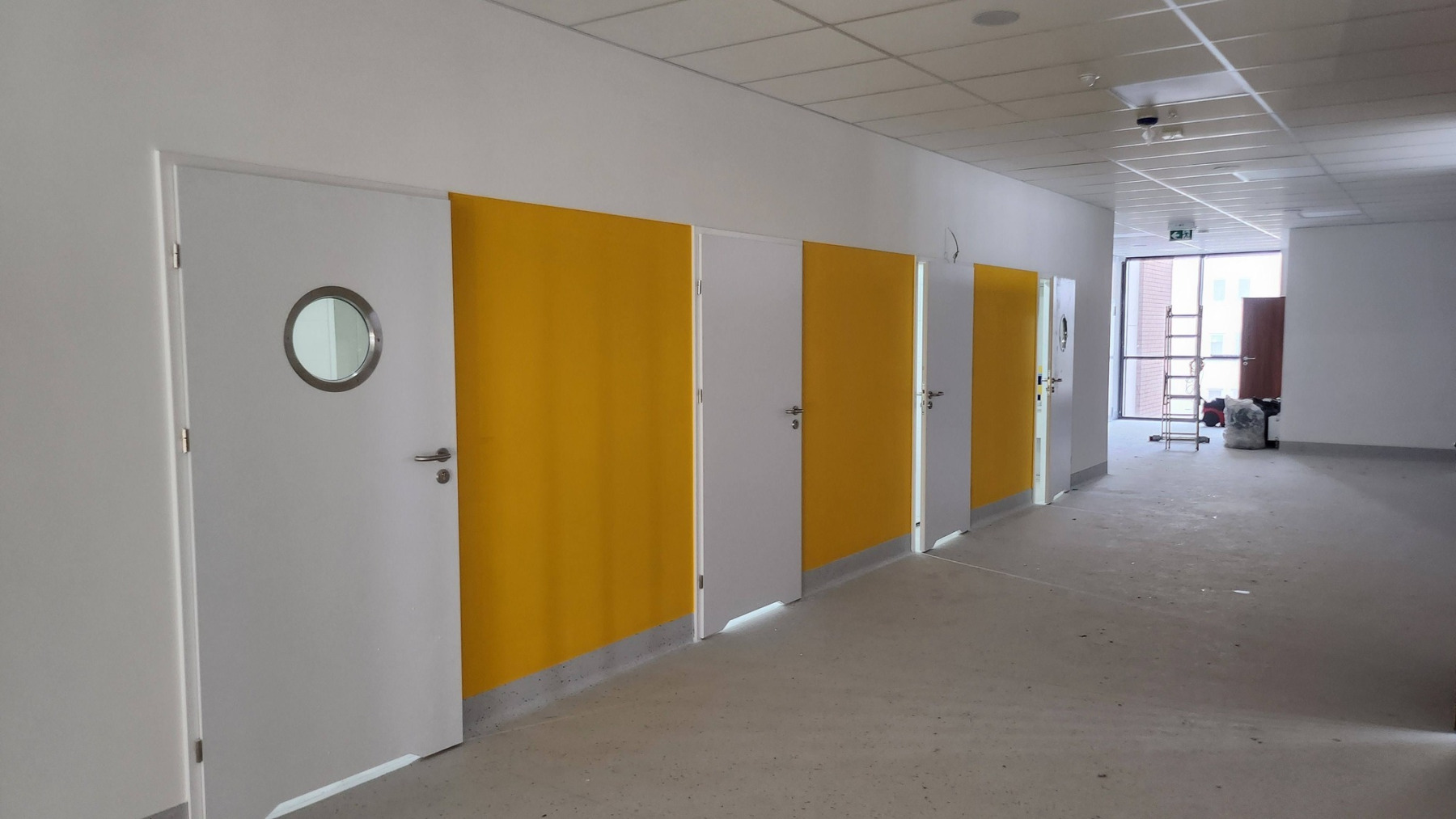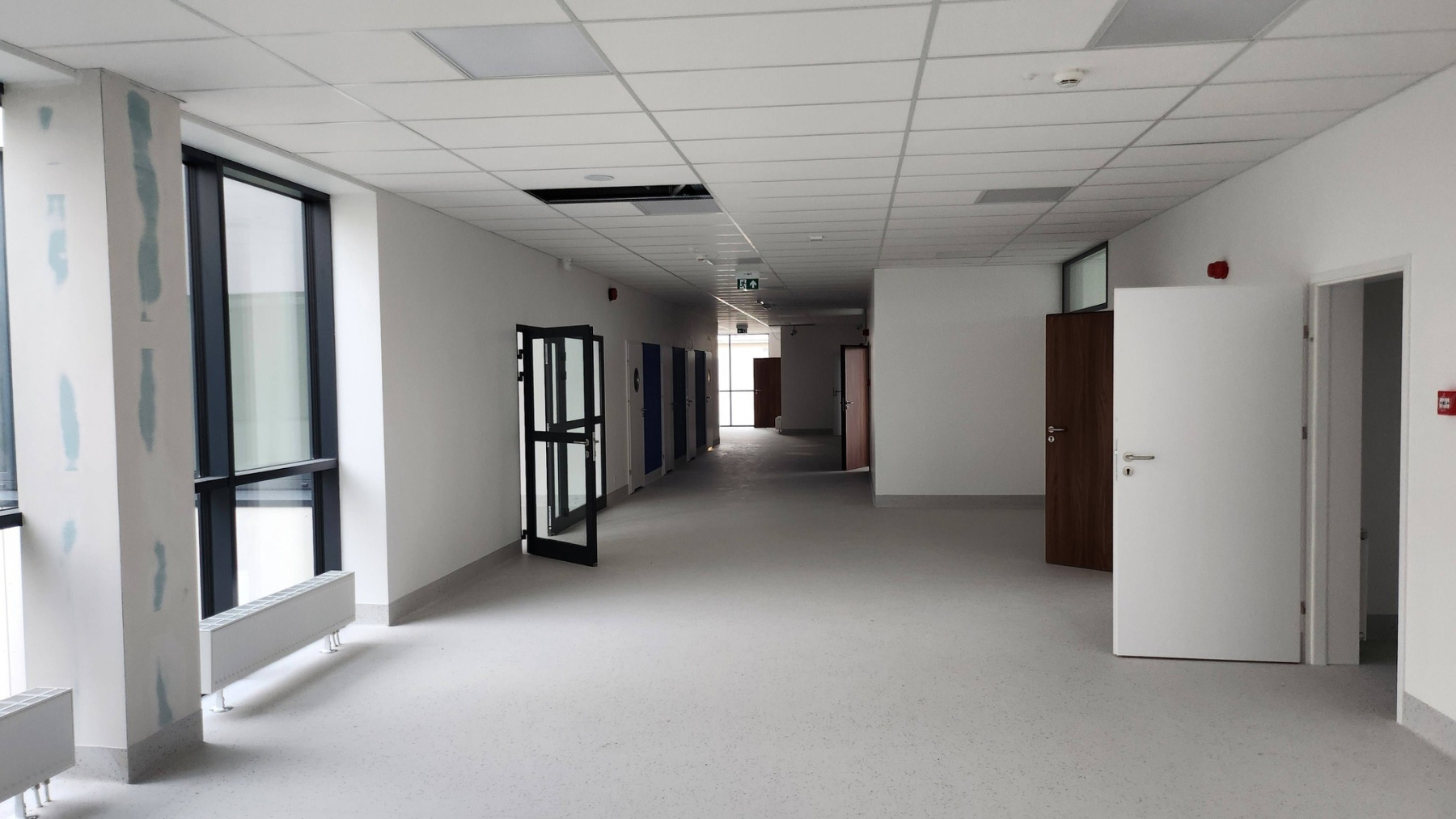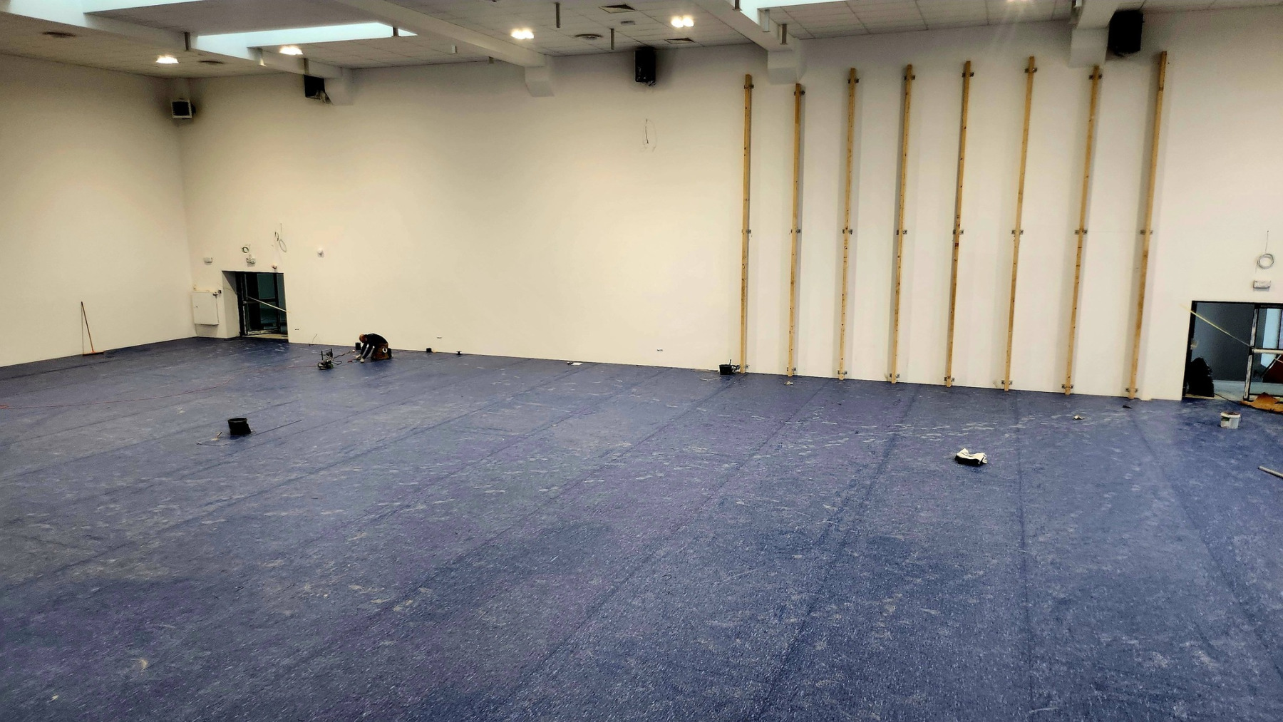 Dzisiejsza wizyta na budowie przyniosła nam wiele radości – z każdym krokiem widać, jak nasza nowa szkoła pięknieje. Na sali gimnastycznej pojawiły się już starannie wymalowane linie do gier zespołowych, a wokół trwają intensywne prace wykończeniowe.