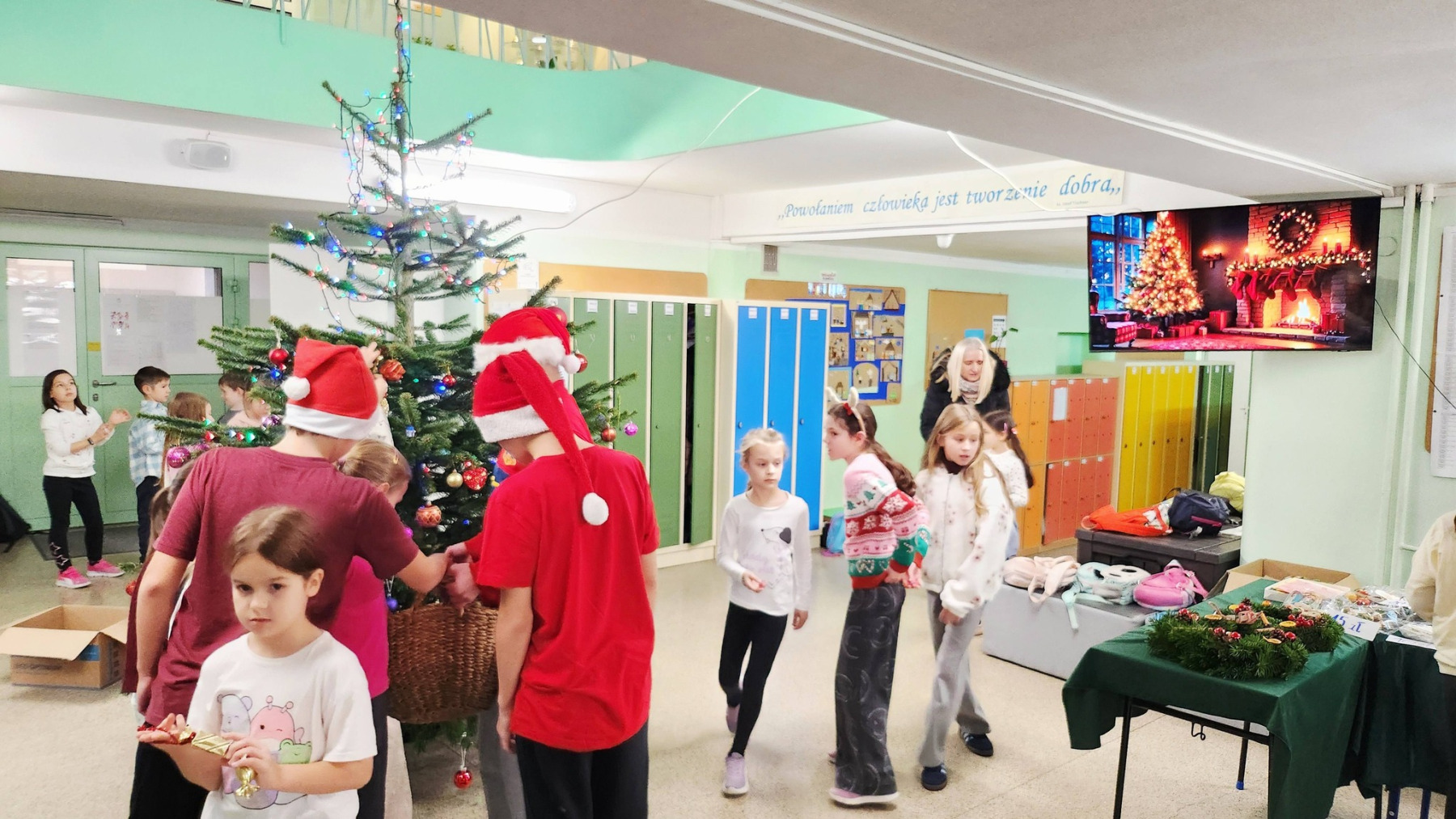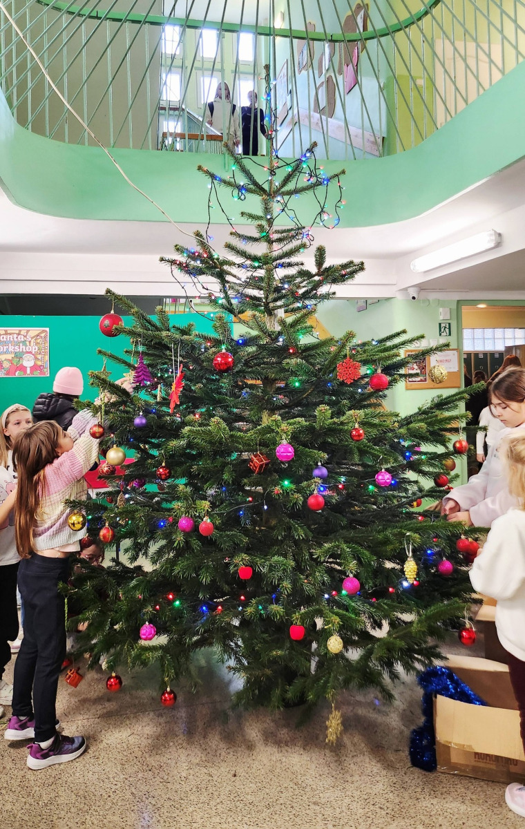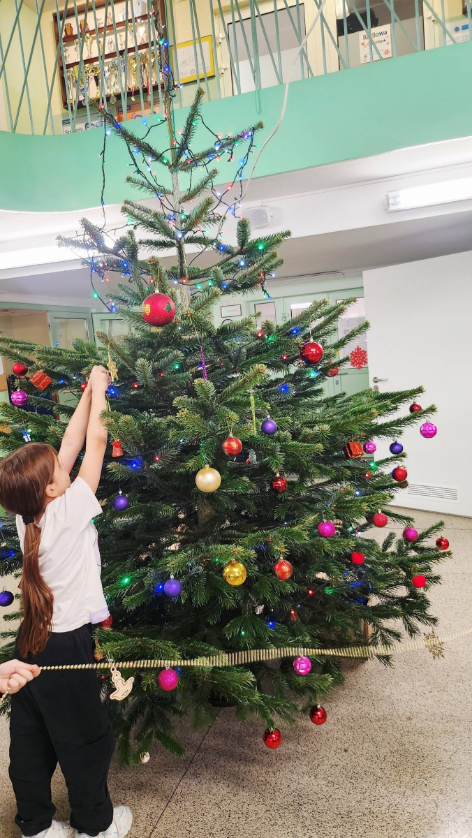 Dziś w holu głównym naszej szkoły zapanował wyjątkowy, pełen radości i świątecznego ciepła klimat. Wraz z dziećmi ze świetlicy ubieraliśmy choinkę, zamieniając wspólne chwile w prawdziwą, bożonarodzeniową opowieść.