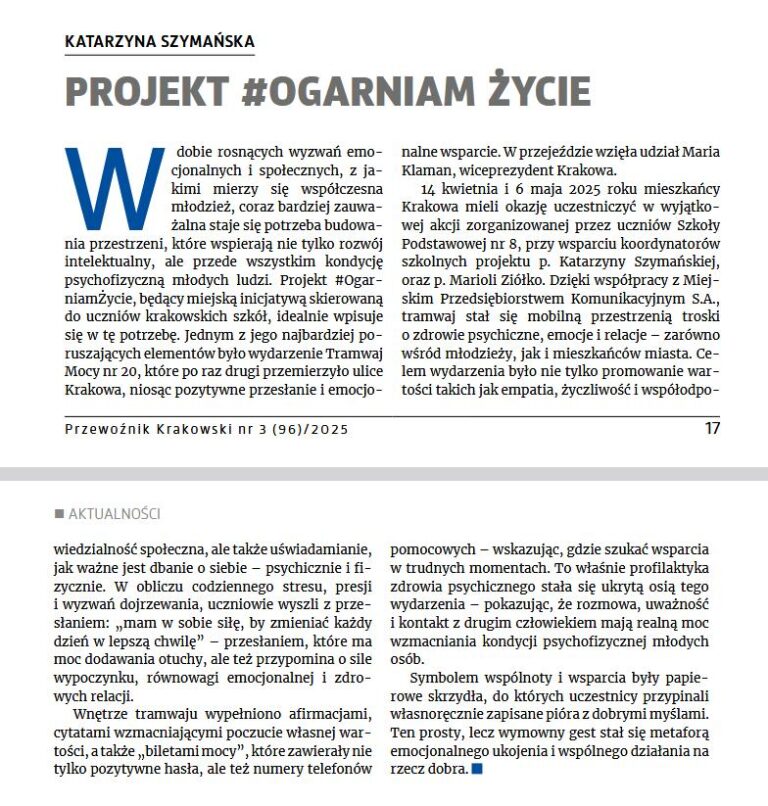 Z radością informujemy, że w najnowszym numerze kwartalnika „Przewoźnik Krakowski” nr 3 (96) 2025 (lipiec–wrzesień) ukazał się artykuł poświęcony przejazdom #TramwajówMocy, które odbyły się w ramach miejskiej kampanii #OgarniamŻycie. To dla nas ogromne wyróżnienie, że mogliśmy być częścią tej ważnej społecznie inicjatywy, której celem jest wsparcie mieszkańców w dbaniu o zdrowie psychiczne, relacje i codzienne wyzwania. Artykuł można przeczytać online: Przewoźnik Krakowski – numer 3/2025 https://mpk.krakow.pl/upload/magazine/przewoznik-krakowski-96-2025-lipiec-wrzesien-internet.pdf?fbclid=IwY2xjawNEYBBleHRuA2FlbQIxMABicmlkETBTMnNIUDRQRFZMQWlZV05TAR56Qlm6h2TleV1Iru6znzZGLdJe5SfFEZT503uiJPsWLtiuaVArexfCZK9MLA_aem_jst29AEQuqScmorDRouy-g (PDF […]