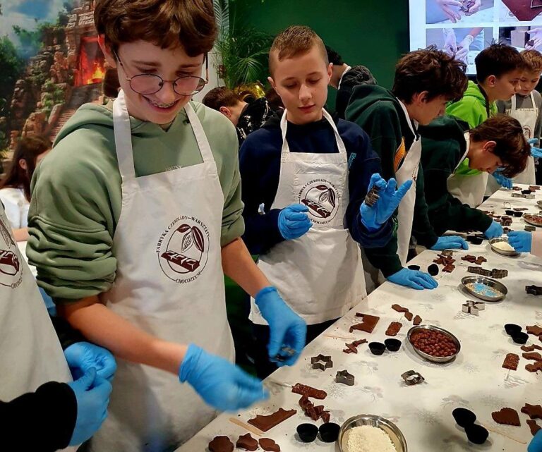 Klasa 7a wybrała się na wyjątkowe, słodkie warsztaty do Krakowskiej Manufaktury Czekolady. Uczniowie mieli okazję poznać tajniki powstawania czekolady, samodzielnie przygotować własne słodkości i spróbować różnych czekoladowych przysmaków. To była nie tylko pyszna, ale i bardzo edukacyjna przygoda, która wzbudziła mnóstwo uśmiechów!