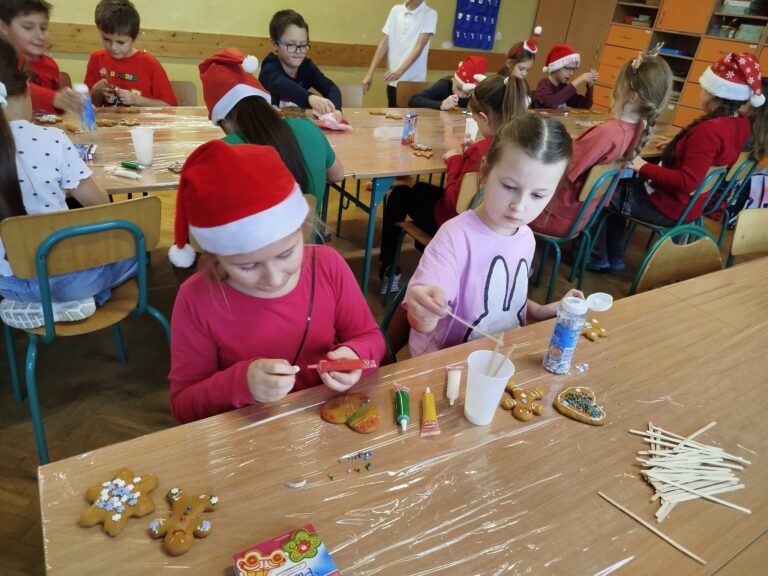 8 grudnia uczniowie z wielką ochotą zabrali się do dekorowania pierniczków. Każde dziecko ozdobiło swoje ciasteczka według własnego pomysłu – powstały pachnące, kolorowe i naprawdę smaczne dzieła sztuki. Gotowe pierniczki szybko zniknęły ze stołów, a w klasie unosił się zapach świąt i mnóstwo radości. To był naprawdę wyjątkowy i pełen słodkości dzień!